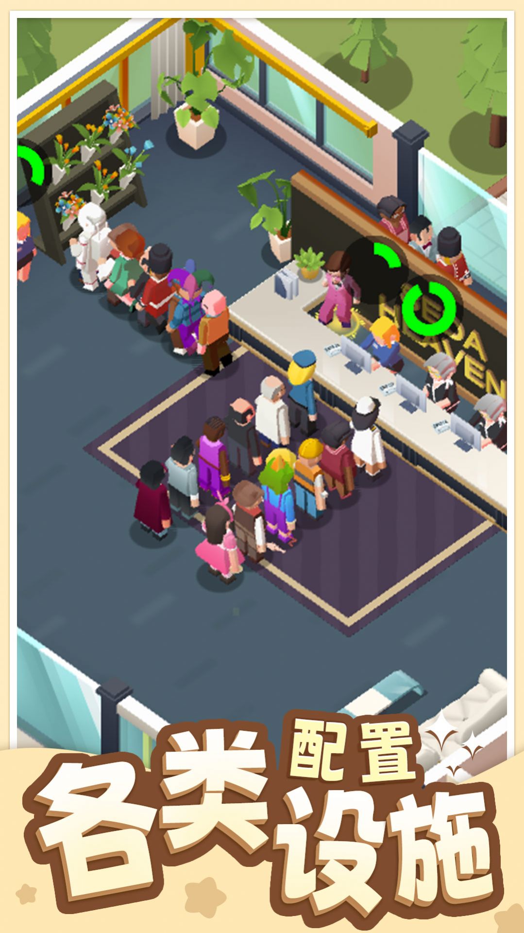 2、瞅大厅互动场景,点棕色柜台前戴黄色安全帽的指引人物,或坐深色沙发与周围人物交流。